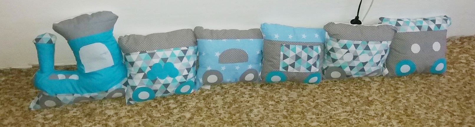 Vlaček je sestaven z jednotlivých polštářků o velikosti 30x25cm, lokomotiva 40x40cm.