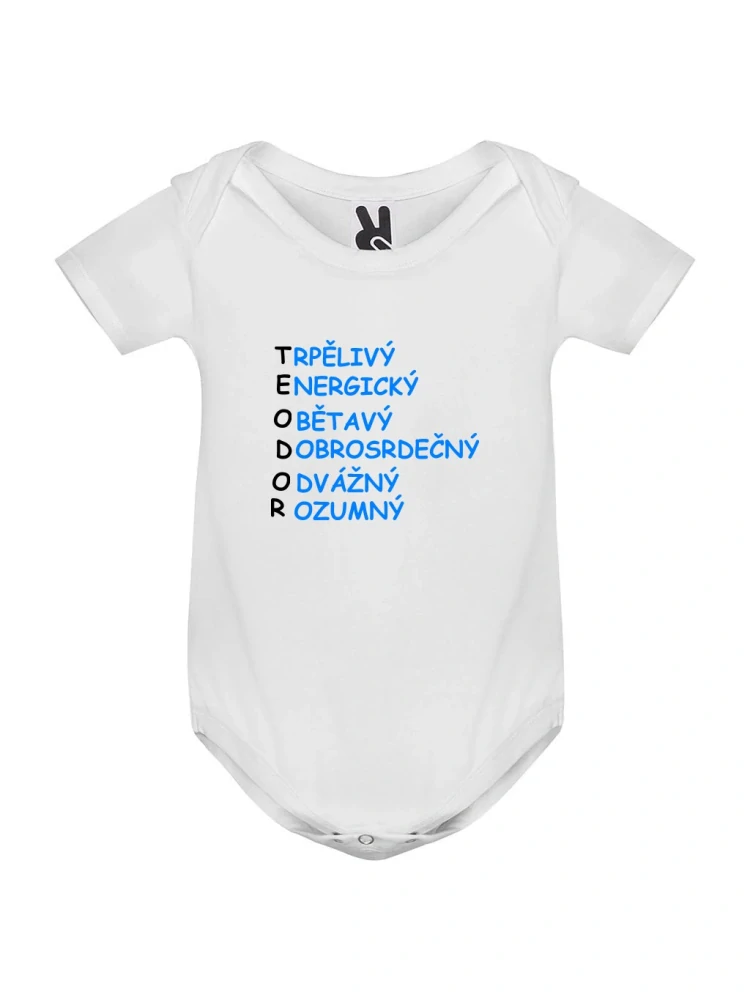 Kojenecké body s originálním potiskem jména a vlastností podle začátečního písmene. Vyberte jméno vašeho miminka a jedinečný přídomek, který podtrhne jeho osobnost (např. „Eliška – energická“, „Matýsek – milý“).