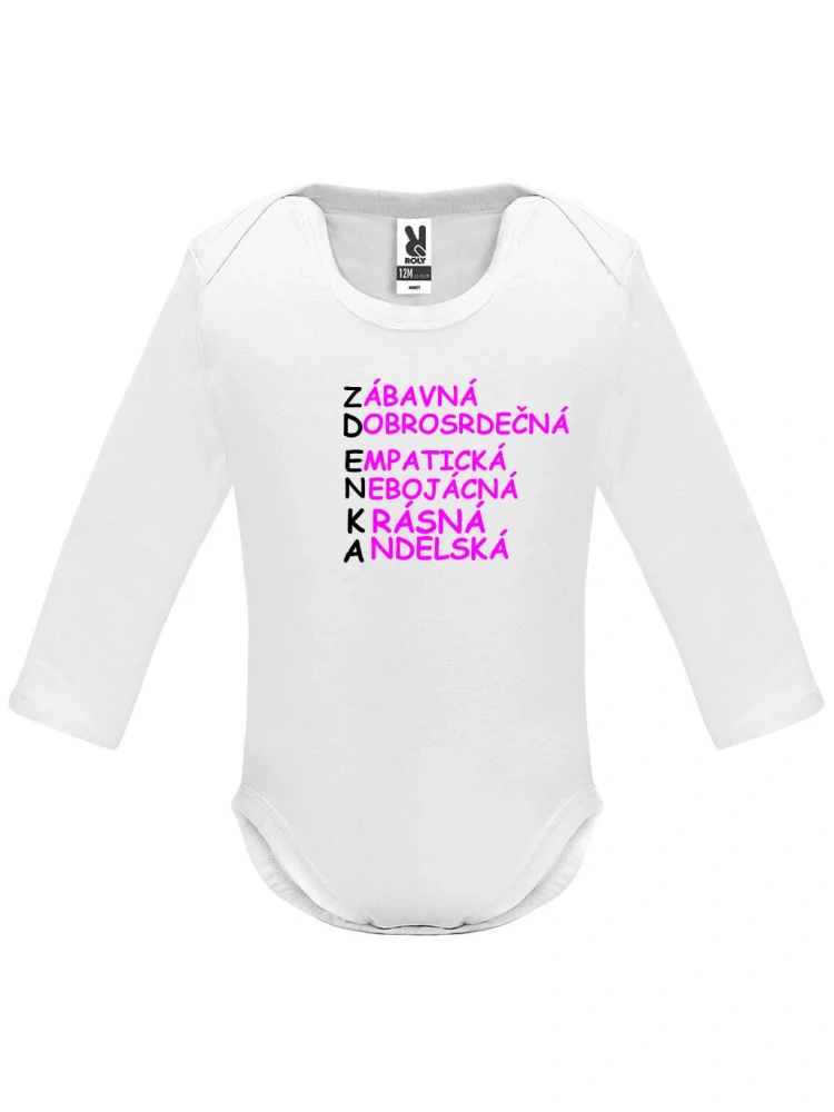 Kojenecké body s originálním potiskem jména a vlastností podle začátečního písmene. Vyberte jméno vašeho miminka a jedinečný přídomek, který podtrhne jeho osobnost (např. „Eliška – energická“, „Matýsek – milý“).