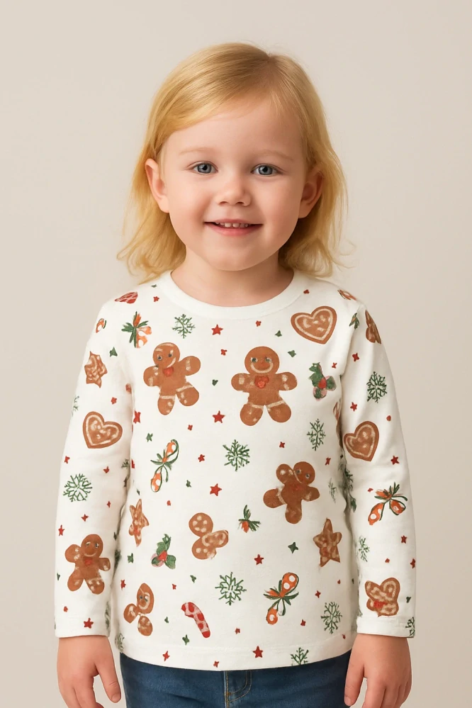 Roztomilé tričko s českými vánočními motivy – perníček, stromeček a ryba – které vykouzlí úsměv na tváři každého malého koledníka. Skvěle se hodí na vánoční besídku, rodinné focení i jako pohodlný kousek na každodenní nošení během sváteční atmosféry.