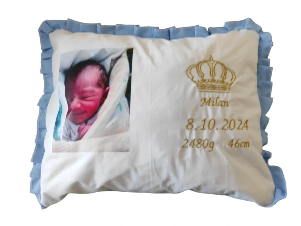 Personalizace: Polštářek lze ozdobit fotografií vašeho miminka a výšivkou iniciálů, data narození, váhy a délky při narození, což dodá vašemu domovu osobitý a srdečný nádech.