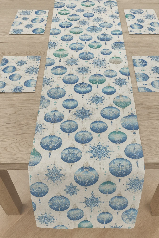 Luxusní vánoční sada – běhoun na stůl a 4 prostírání s elegantním zimním motivem. Kombinace vánočních dekorací, poinsettií, luceren, dárků a slavnostních detailů dodá každé tabuli kouzelnou atmosféru. Kvalitní bavlněná látka je příjemná na dotek, pevná a dobře drží tvar. Ideální pro sváteční stolování, adventní období i vánoční večeři. Originální dekorace pro váš domov nebo krásný dárek.