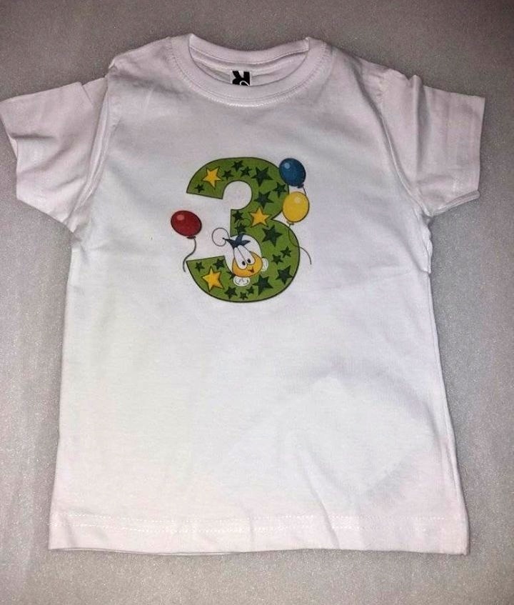 Bavlněné tričko s potiskem trojky a obrázkem Velikost 3 roky 104-110 Materiál polyester Údržba: prát ručně, nebělit, nesušit v sušičce, obrázek přežehlit přes pečící papír.   celý popis