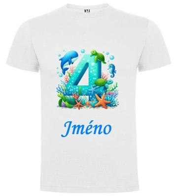 Dětské bavlněné tričko s potiskem Moře k 4. narozeninám. Veselý motiv, příjemný materiál, originální dárek pro malé oslavenkyně i oslavence.