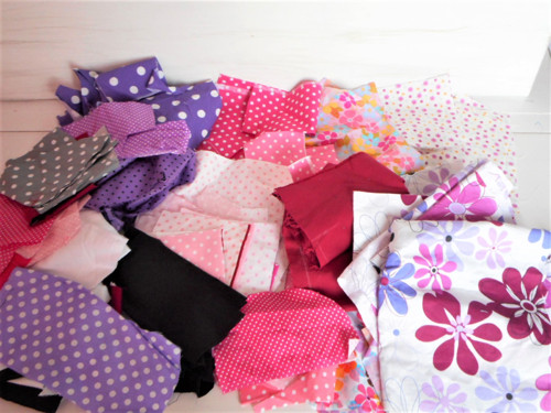 Různě velké kusy látek jednobarevných i potisk. Balíček je vhodný na různé tvoření .